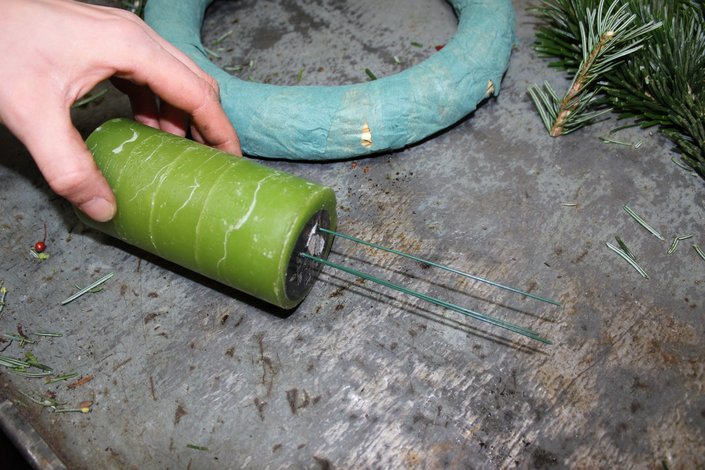Schon fertig, war doch gar nicht schwer. Jetzt geht’s ans Verzieren. Zuerst wird der feste Draht in die Kerzen gedreht. Den Draht erhitzen, dann geht es leichter.