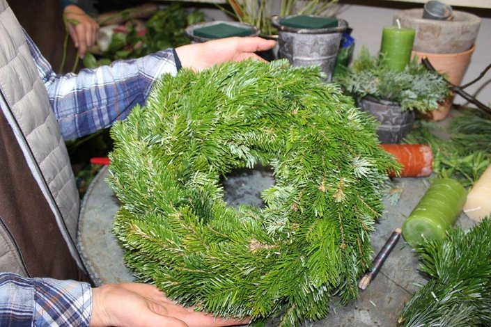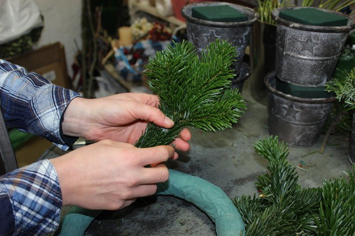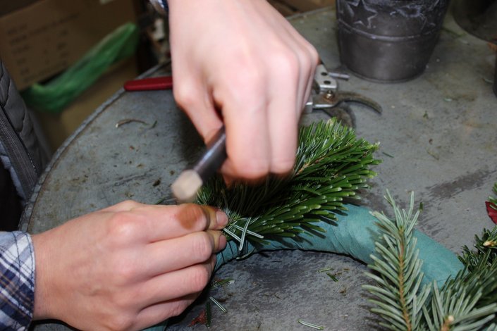 Tipps vom Profi: Ideal sind Zweige der Nordmanntanne, weil diese leichter zum Verarbeiten sind. Man schneidet sich zuerst kleine Zweige zurecht, und bindet alles zu kleinen Büscheln zusammen. Danach bindet man die Büschel mit dem Draht fest. Wichtig ist, dass man die Büschel sehr dicht nebeneinander bindet, damit man den Strohreifen nicht sieht.