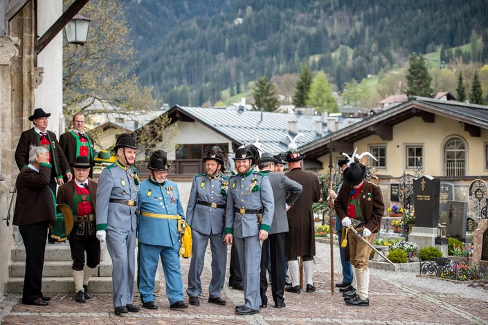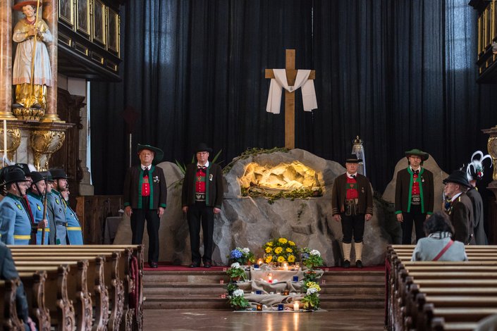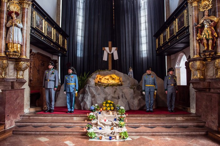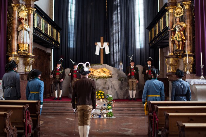 Jedes Jahr verwandelt sich der Altarraum der Kitzbüheler Pfarrkirche am Karsamstag für wenige Stunden in eine steinerne Landschaft. Ein großer Fels in der Mitte, direkt vor dem Altar, symbolisiert das Grab Jesu Christi. Neben Blumen und Kerzen stehen vier Männer. Zusammen mit Kollegen, die sie später ablösen werden, absolvieren sie den alten Brauch der Grabwache. „Das stammt aus der Heiligen Schrift“, erklärt Leo Moser, Obmann der Kitzbüheler Kaiserjäger. „Die Römer haben ja nach dem Tod Jesu das Grab bewacht, um zu verhindern, dass der Leichnam von seinen Jüngern gestohlen wird“, ergänzt Josef Profanter, Obmann des Vereins der Südtiroler in Kitzbühel. Um diese biblisch bekundete Situation auch heute ins Bewusstsein der Bevölkerung zu rufen, treffen sich am Karsamstag Mitglieder von sechs Kitzbüheler Traditionsvereinen zur gemeinsamen Grabwache.