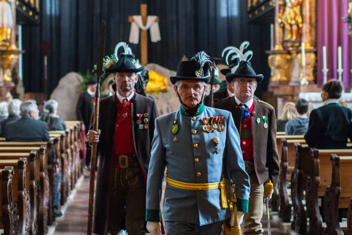 „Ursprünglich haben das die Schützen gemacht, bis die Grabwache in den 1970er Jahren vom damaligen Pfarrer abgeschafft worden ist“, erzählt Leo Moser, „er hielt sie nicht mehr für zeitgemäß und wollte niemanden in der Kirche mit Waffen stehen haben.“ Die Schützen wachten nämlich nicht nur in ihrer historischen Uniform, sondern auch mit dem Gewehr bei Fuß. „Heute stört sich daran aber niemand mehr“, so Leo Moser weiter. Seit dem Jahr 2010, als die Grabwache auf seine Initiative hin wieder eingeführt worden war, halten auch die Kaiserjäger mit Säbel oder Bajonett und die „Trachtler“ mit ihren Lanzen Wache. „Nur die Südtiroler haben ausschließlich die Faust“, scherzt der pensionierte Polizist.