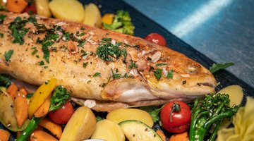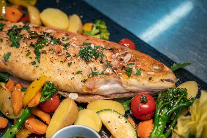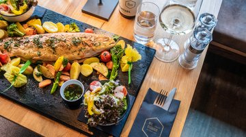 Erleben Sie die exquisite Forelle Müllerin, frisch aus heimischen Gewässern, die durch ihre Zartheit und den delikaten Geschmack besticht. Traditionell in Butter gebraten, entfaltet die Forelle ihr volles Aroma und bietet einen unvergleichlichen Genuss. Dazu serviert das Team des Stegahauses samtige Butterkartoffeln, die mit ihrer cremigen Textur perfekt zum Fisch passen. Veredelt wird dieses Gericht durch aromatische Nussbutter, die mit ihrem nussigen, leicht süßlichen Geschmack eine raffinierte Note hinzufügt. Ein Klassiker der regionalen Küche, neu interpretiert und ideal für ein besonderes Geschmackserlebnis. Die Forelle Müllerin des Steghauses ist ein Fest für die Sinne.