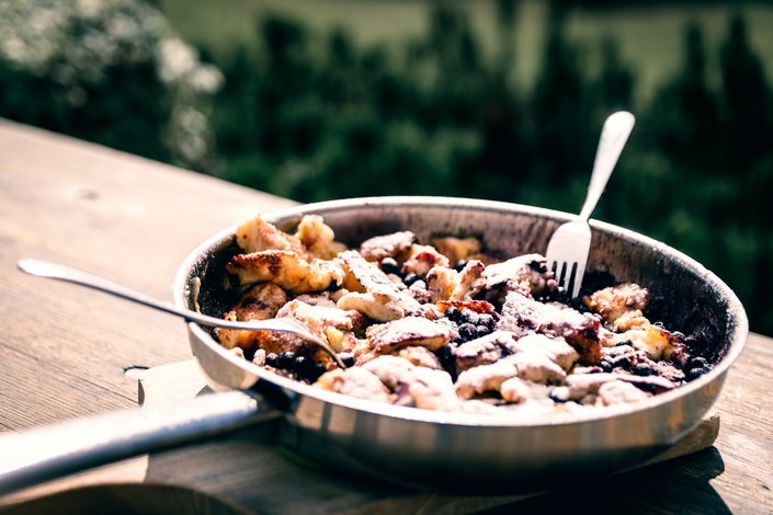 Dieser österreichische Klassiker ist nicht nur im Winter eine beliebte Stärkung, sondern passt auch ganz hervorragend in den Kitzbüheler Kulinarikherbst. Die frischen Moosbeeren – in Deutschland auch als Heidelbeeren bekannt – pflückt die Wirtin selbst mit der Hand. Natürlich kommen nur die besten Beeren in ihren berühmten Kaiserschmarrn, den sie auf Wunsch auch mit Rosinen serviert. Ein Augenschmaus ist auch die Inszenierung am Tisch: Jeder Kaiserschmarrn wird in der Pfanne und mit ordentlich Staubzucker serviert.