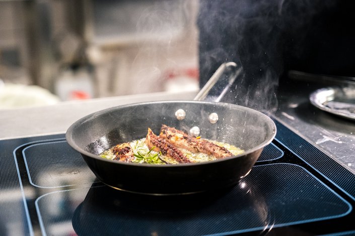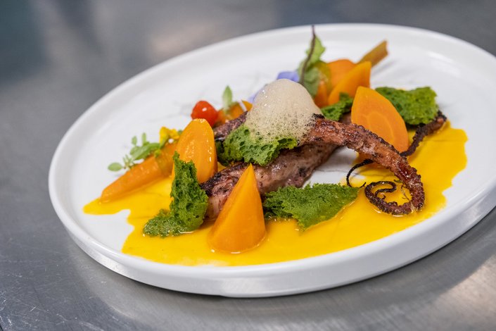 Marinierter Oktopus | Kräuterwiese | Sauce a la Bouillabaisse | Passionsfrucht-Karotten