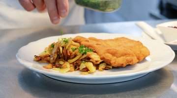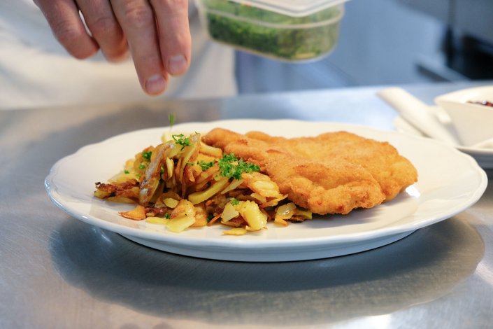 Wiener Schnitzel vom Kalb aus der Pfanne mit Röstkartoffeln