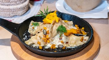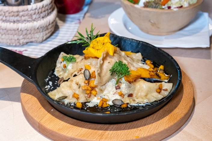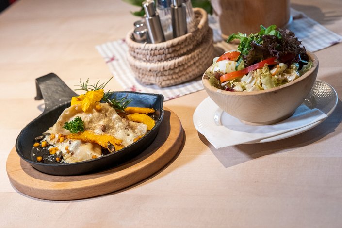 Tauchen Sie ein in die kulinarische Magie des Herbstes mit den Kürbis-Ravioli der Melkalm. Zarte Teigtaschen, gefüllt mit einer cremigen Füllung aus aromatischem Kürbis, übergossen mit Butter und Parmesan. Dieses regionale Herbstgericht bietet ein harmonisches Zusammenspiel von herzhaftem Kürbis, Butter und Parmesan das sowohl Gaumen als auch Herz erwärmt.