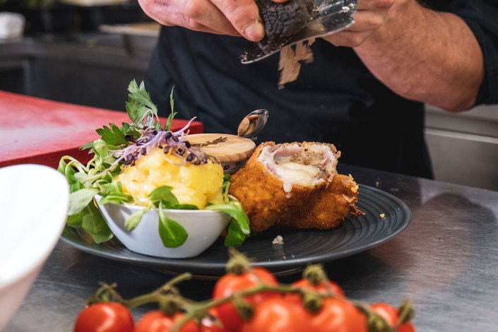 Zartes Cordon Bleu mit exquisitem Trüffelaroma in knuspriger Panade. Begleitet von einem Kartoffel-Vogerlsalat, vereint dieses Gericht raffinierten Geschmack und frische Komponenten zu einem Gaumenschmaus der Extraklasse.