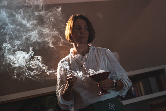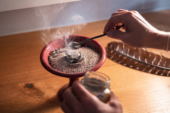 Beim Räuchern geht es auch immer um die Zusammensetzung der Mischungen. Hier wird mit Harzen, zum Beispiel Naturharzen wie Weihrauch, Myrre, Styrax und ähnlichem geräuchert. Immer auf die jeweilige Notwendigkeit und Stimmung abgestimmt.