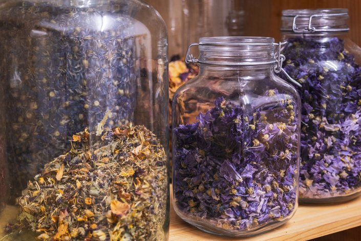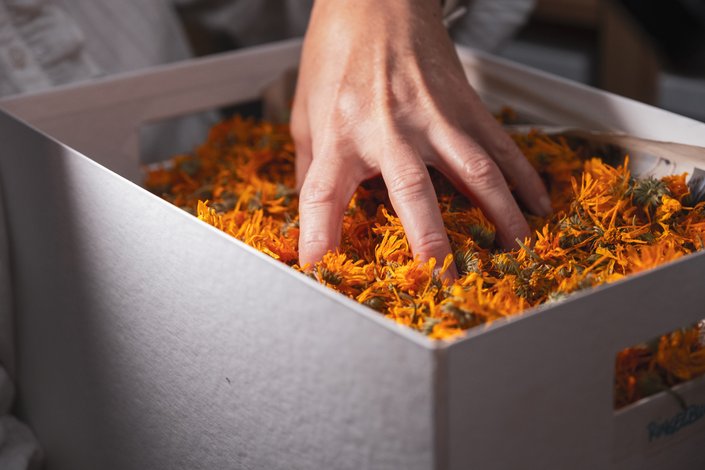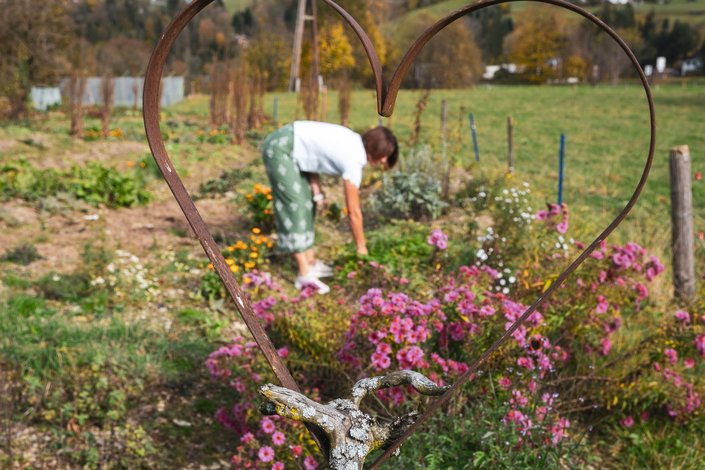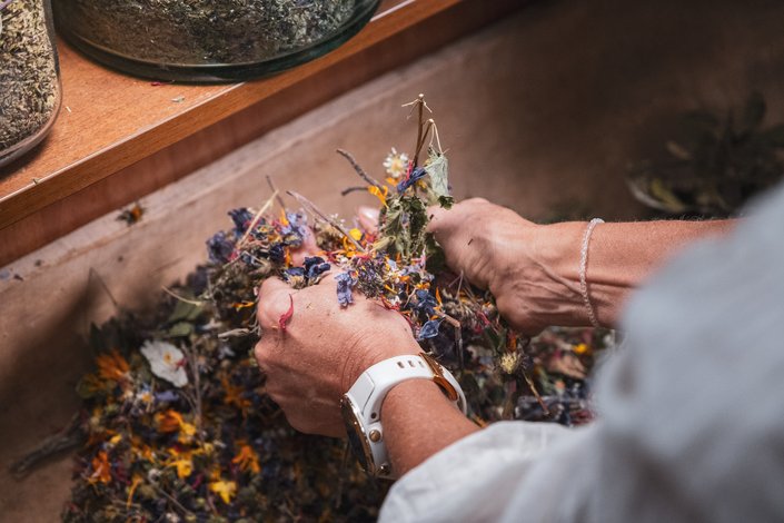 Der Garten von Anneliese Bachler-Hechenberger ist ein wahres Kleinod, ursprünglich angelegt von ihrer Mutter. Er ist voller Blumen und Kräuter, die mit viel Liebe von der Familie gepflegt werden. Schmetterlinge und Bienen tummeln sich hier auch noch im Herbst – es summt und surrt. Anneliese erzählt uns, wie sie nach einer schweren Erkrankung als erstes wieder begann, Kräuter und Blüten für ihre Teemischungen zu sammeln. Von März bis in den späten Herbst hinein pflückt und trocknet sie geduldig Kräuter, Blätter, Blüten und Wurzeln für ihre individuellen Teemischungen. Wichtig zu beachten ist dabei das Ernten der Kräuter zum richtigen Zeitpunkt – an sogenannten Lichttagen. An diesen Tagen behalten die gesammelten Blüten auch nach dem Trocknen ihre natürliche Farbe und Intensität.