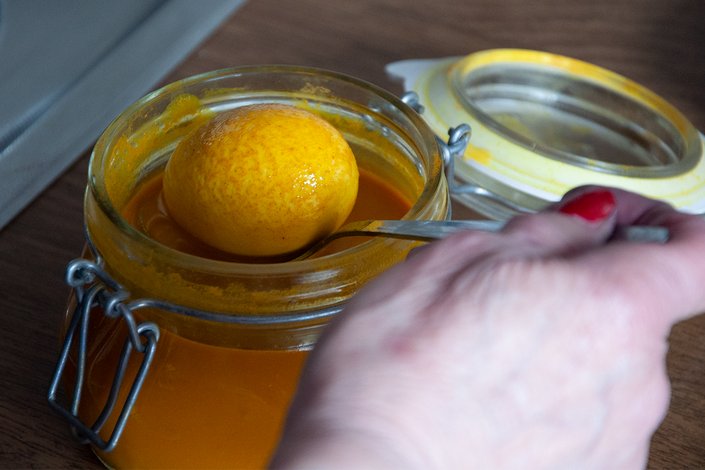 Schon kann das Färben beginnen. „Die gekochten Eier übergieße ich immer noch einmal mit heißem Wasser, dann nimmt die Schale die Farbe besser auf“, merkte Hilde Flack an, „und dann werden sie einfach in der Farbe vollständig versenkt.“ Nach ein paar Minuten mit einem Löffel das Ei vorsichtig umdrehen, damit es sich gleichmäßig färbt und wieder rund fünf Minuten Zeit geben. Je länger es badet, desto intensiver wird das Ergebnis – zu lang gibt es hier nicht. „Die Farben werden natürlich nicht so quietschbunt wie jene aus dem Supermarkt. Es kann auch sein, dass zwei Eier am Ende ganz anders aussehen, obwohl sie in der selben Farbe gebadet haben. Das ist einfach die Natur“, freut sich die Oster-Insiderin über ihre Erfahrungen.