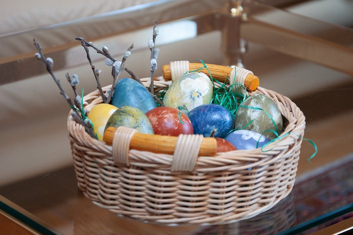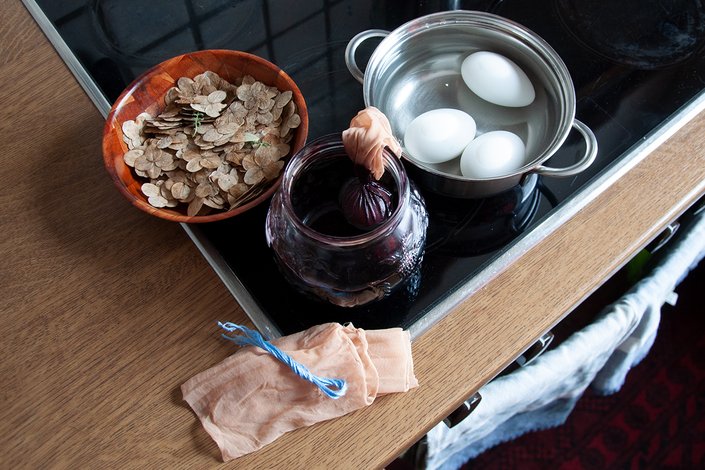 „Eier von freilaufenden Hühnern eignen sich am besten, weil die Schale viel stärker ist als jene von Batteriehennen“, erklärt die Kitzbühelerin. Weiße Eier bilden eine ideale Grundlage für die Farbe, aber auch braune Eier können zu originellen Ergebnissen führen. Als allererstes müssen sie gekocht und mit Essigwasser abgespült werden. Dann geht es an die Farben. „Da hat jeder eigentlich seine eigenen Ideen“, lacht Hilde Flack. Die bekannteste Art ist jene mit roten oder gelben Zwiebelschalen. Bei der Verarbeitung sollten sie möglichst frisch sein. „Rote Rüben geben auch einen schönen Rot-Ton. Spinatblätter oder Petersilie nimmt man für Grün und mit Heidelbeeren lässt sich hervorragend blaue Farbe herstellen“, so Hilde Flack. Auch Kurkuma, Safran (beide gelb), Mate-Tee (grün) oder Kaffee (braun) eignen sich ideal als natürliche Farbgeber.