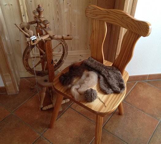Das Spinnen war früher in unserer Gegend eine gesellige Tätigkeit der Bäuerinnen im Winter. Man hat sich zum Spinnen und Tratschen getroffen, wichtige Neuigkeiten ausgetauscht und dabei die Wolle der eigenen Schafe versponnen. Nicht verwunderlich, dass an Martinas Spinnrad bereits mehrere Generationen gesponnen haben. Schon etwas in die Jahre gekommen, aber es funktioniert einwandfrei. Es gibt mittlerweile moderne Spinnräder zu kaufen, aber Martina möchte das gute alte Stück nicht tauschen – stecken doch so viele Geschichten dahinter.