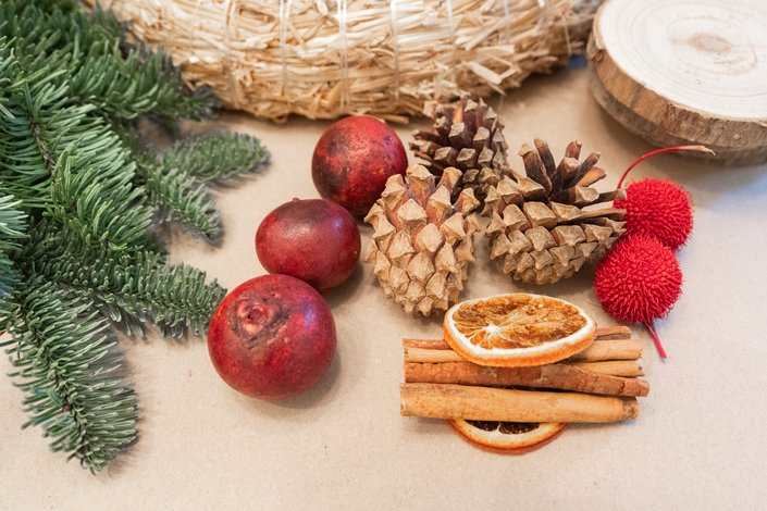 Auch die Dekoration des Adventkranzes ist reine Geschmackssache. Gerne werden simple Naturprodukte verwendet wie Nüsse, Tannenzapfen, Zimtstangen, getrocknete Früchte oder Beeren. Je nach Beschaffenheit befestigt man die Deko-Bestandteile mit Blumendraht, Gestecknadeln oder Bändern. Je nachdem hilft oft auch eine Heißklebepistole. Ansonsten gibt es in Sachen Dekoration nur eine Regel: Genutzt wird, was gefällt. Von Trockenblumen über Federn und Schleifen bis hin zu kleinen Figuren ist alles erlaubt.