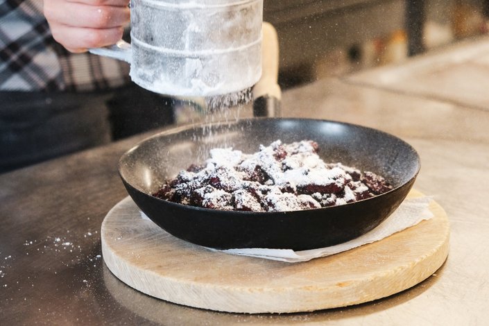 On the traditional Tyrolean menu at Brugger-Alm, you’ll find not only the autumn special, blueberry pancake, but also Tiroler Gröstl, smoked or Müllerinnen-style trout, and baked goat cheese. The goat cheese is made on-site; the owner milks the goats and processes the milk into cheese, which is available both on the menu and in the farm shop.