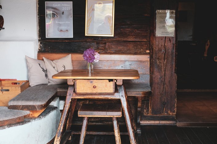 Set at an altitude of 1,365 meters in Jochberg, Brugger-Alm offers a breathtaking mountain panorama that enhances the pleasure of dining. The hearty, down-to-earth Tyrolean cuisine will win over every palate. The menu features local delights such as Gröstl, char, and moss berry pancake, as well as baked goat cheese—made on-site, as the Alm has been a dairy farm for over 200 years. The surrounding mountain views are stunning: to the west, you can see the Kleine Rettenstein, the Gaux-Alms, the southern Kitzbühel Alps, and to the south, the high Tauern. The hiking area around Brugger-Alm offers a suitable route for every hiker.
