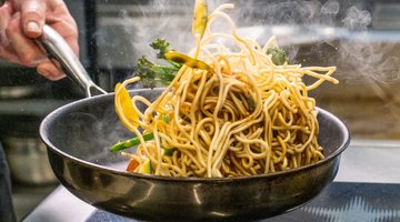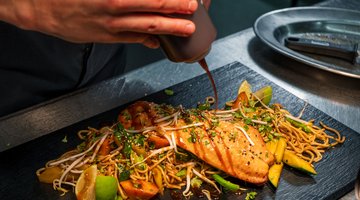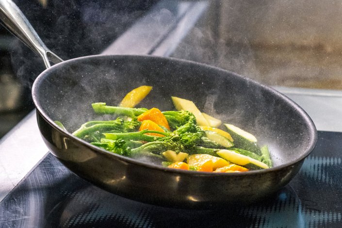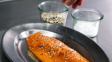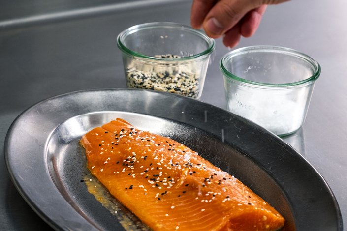 Marinate filleted & plucked salmon trout fillet with teriyaki, sesame seeds and sea salt. Place in the oven at 180 degrees for 6 minutes. Put the rice noodles in warm water. Heat a hot pan with sesame oil and roast any vegetables in it. Season with salt, pepper and coriander. Add the finished rice noodles to the roasted vegetables in the pan and deglaze with Pad Thai, toss and serve.