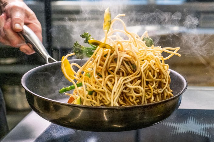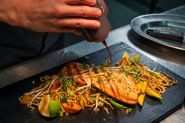 Salmon trout Asian egg noodles | sesame | wild broccoli | carrot vegetables | baby spinach