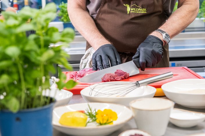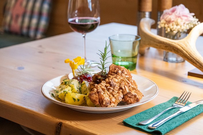Let yourself be enchanted by the breaded venison schnitzel with almonds at Branderhofstube Wildpark. Delicately seasoned venison, baked in a crispy almond crust, offers an exquisite wild flavor that delights with its tender texture and nutty taste. Accompanied by golden-brown parsley potatoes, enhanced with fresh parsley for a harmonious side, and finished with the fruity sweetness of cranberries, this dish provides a refined and contrasting note. Perfect for gourmets and lovers of traditional cuisine, this breaded venison schnitzel is a hearty treat of the highest quality.