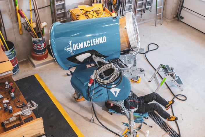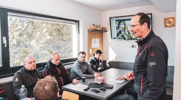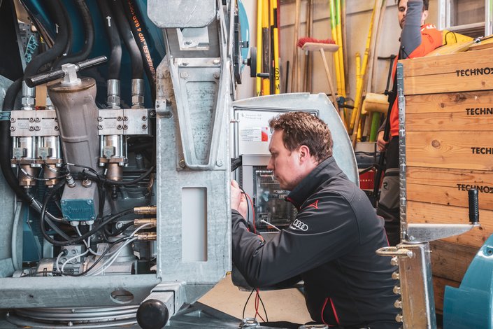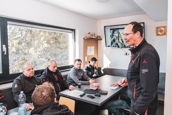 In addition to the garage for the snowgroomers, the Streiteck Competence Centre also houses the workshop for the snow guns and the filling station for the snowgroomers. The snow guns and also the piste machines are constantly overhauled and checked. The mechanics on site know every machine down to the last detail. When the piste machine team starts work, the entire team meets for a meeting in the Streiteck Competence Centre. This is also where the allocation of the individual piste sections is discussed.