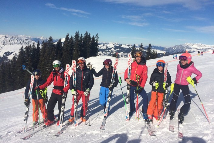 In our ski school (note Rote Teufel), twice a week a ski instructor training for all takes place (start 08:00 Hahnenkammbahn). Mostly on the Streif, the own skills and the topics relevant to the lessons are repeated and trained. For the ski instructors it is a great chance to be the first to master the Streif early in the morning. In addition, there are regular mandatory training sessions, depending on the level of training of each ski instructor.