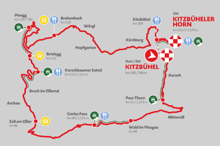 Starting in the Vorderstadt of Kitzbühel, the course leads over the Pass Thurn into the Pinzgau region on the Gerlos federal road. The course reveals a wonderful view of the Großvenediger and of the Krimml Waterfalls before climbing steeply up the new Gerlos alpine road. With two passes in the legs, the Zillertal heads out of the valley to Bruck. The flat ride comes to an end when the Kerschbaumer Sattel has to be conquered. This pass winds its way over into the Alpbach Valley with its narrow and steep road. Once there, the route leads to Brixlegg, Kramsach, makes a loop over Brandenberg to get to Angerberg and back to Kitzbühel via the Brixental through the final climb up the steepest bike mountain in Austria: the Kitzbüheler Horn.
