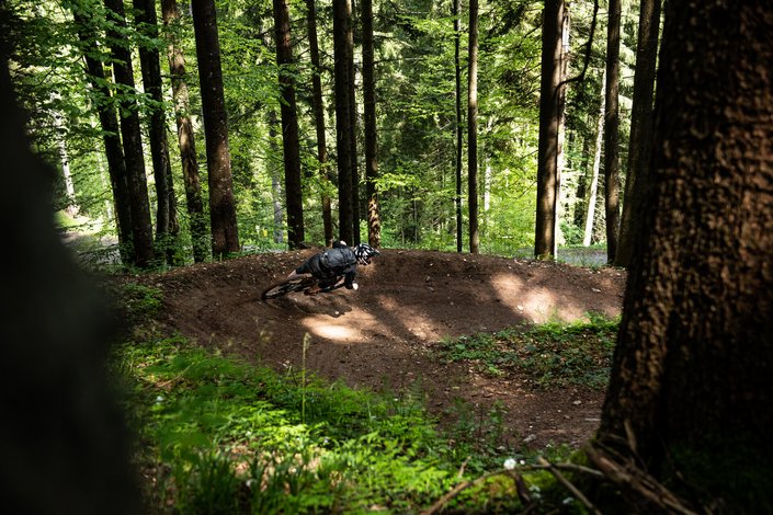 Starting from the top of the Gaisberg lift you begin with 4 switchbacks and some roots to make you up! A wall ride before the big right hander into the forest is always fun. Once in the forest it's all action. The mid section is the hardest including a 50 meter steeper root passage. Shortly before the bottom there are two expert drop which should only be ridding before checking out the landing. The final turns are a cross between bike park and natural features. Tip - pick your line based on exit flow if you want to make this trail easier.