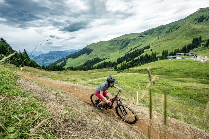 7.1 km of roots, drops, berms, rocks, forests and even some uphill northshore. If you like your challenges tough and with a bit of everything, then this is your trail. Part of the KitzAlp race circit, the Fleckalm trail is your do it all race track or go to shred trail when riding with your crew.