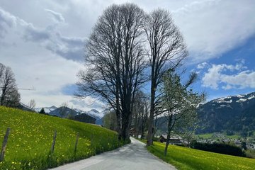 After a short stop, the hike continues along the Römerweg and simultaneously towards the outskirts of the town. Looking back from there to the centre of the town, some representatives of the villa and hotel architecture of the last century can still be seen today. The architecture is characterised by its natural stone walls, medieval timber-framed constructions, spacious glass verandas and balconies and is today complemented by modern hotel buildings, which, as in many other alpine winter sports destinations, are increasingly expanding towards the outskirts of the village.