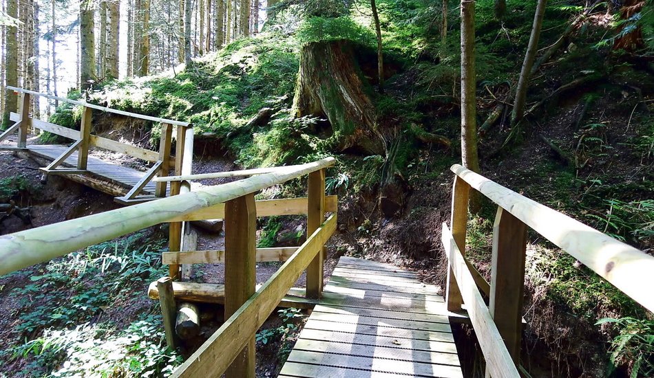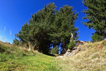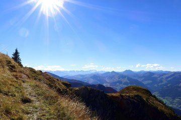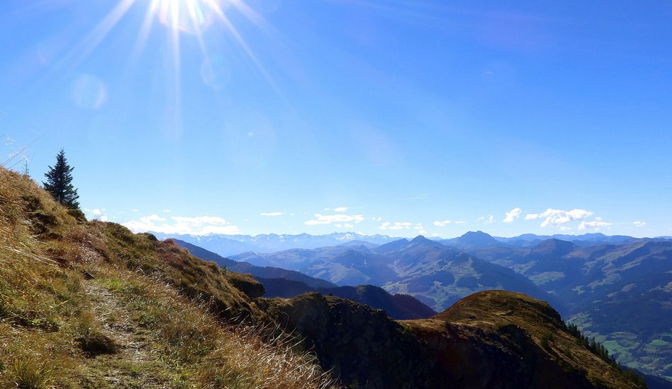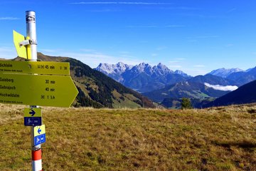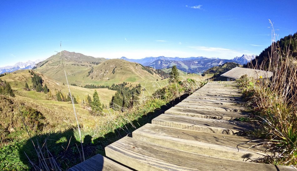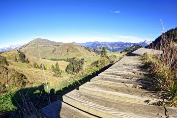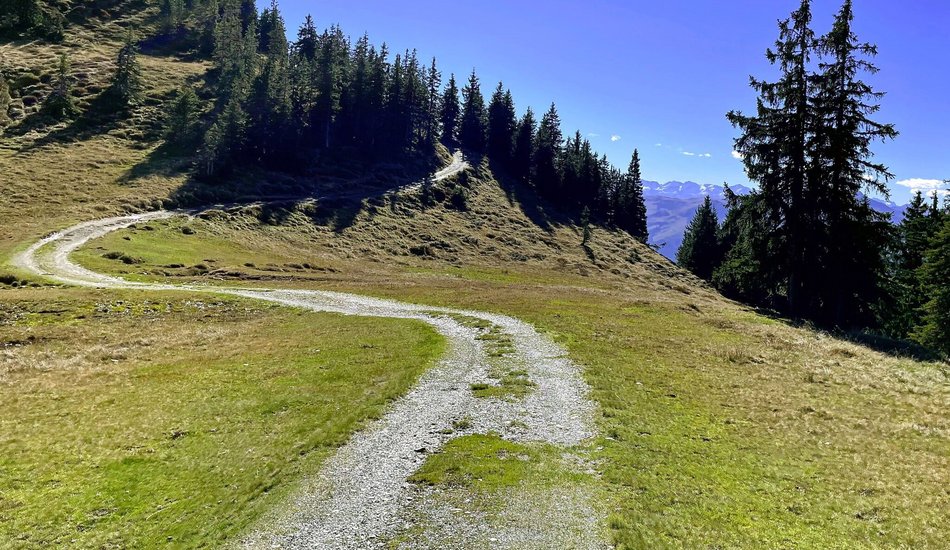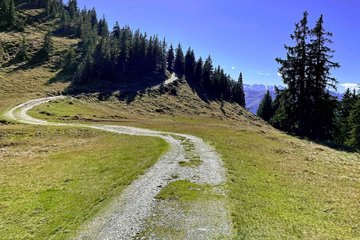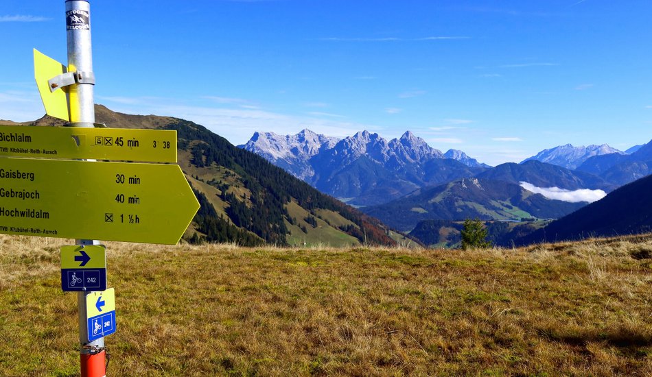From Alpenhaus, head towards Lämmerbichl and Bichlalm, then continue south towards Hochwildalm and Gaisberg. Here, you'll encounter beautiful, flowy trails with stunning views from the Hohe Tauern to the Leoganger and Lofer Steinberge. Follow the signs to Hochwildalm. Before reaching Gebrajoch, veer slightly right towards the valley, briefly traversing a forest road before returning to a scenic woodland trail that leads to Hochwildalm. This is an excellent spot for a rest.