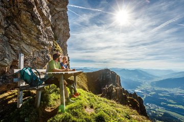 On the descent, hike up to the section that branches off to St. Johann in Tirol, passing an impressive viewing cross up at around 1,900 metres altitude and take the same path back. The path branches off here and is well-secured with ropes, proceeding through steep terrain (as an alternative to the Scheibersteig you could opt for the easier but longer Hornrundwanderweg). A spectacular route section on the north west side of the Kitzbüheler Horn!