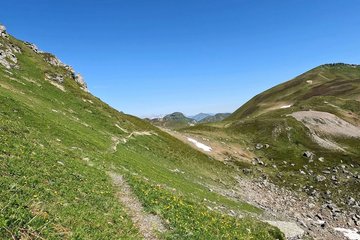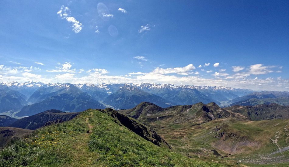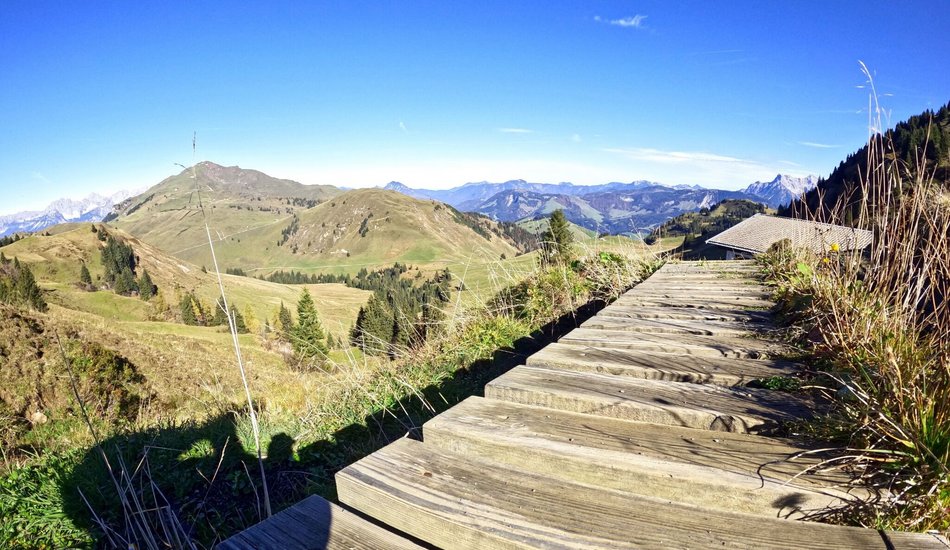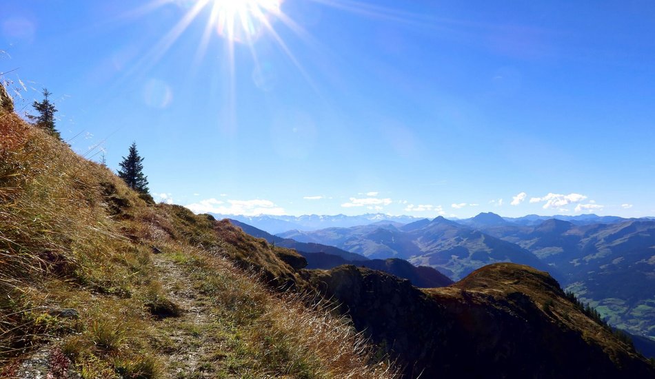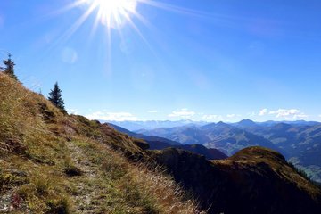 From Geisstein, the trail offers incredible views of the Hohe Tauern as it leads towards Pinzgau. At Pass Thurn, cross to the opposite side of the valley, entering the KitzSki area with Resterkogel. The ridge continues to Kleiner Rettenstein, requiring sure-footedness, and over Schwarzkogel to the start of the legendary Hahnenkamm race. The final downhill section follows the path of ski stars along the Streif hiking trail, passing famous spots like the Mausefalle and Hausbergkante, returning to the starting point in Kitzbühel's city center.