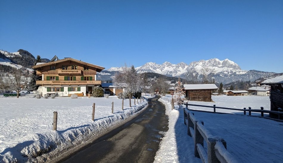 Hike to a hill south of Kitzbühel with old farms and a wonderful view of the Wilde Kaiser Mountains.