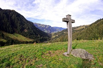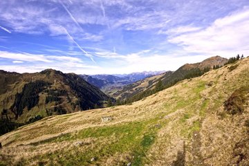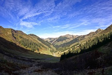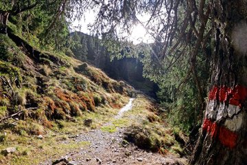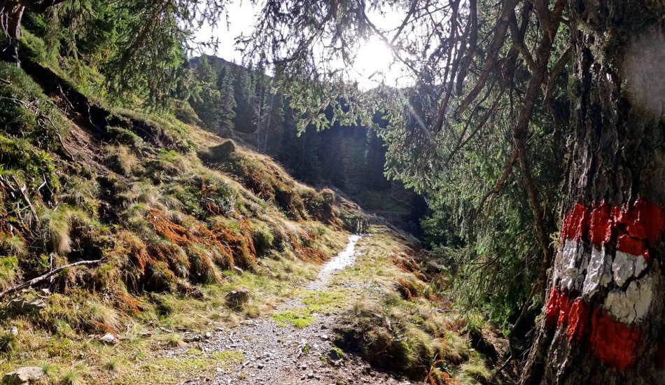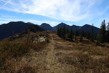 From Hochwildalm, enjoy the view of a large part of the route by looking south into the valley basin. Descend a few meters on gravel, then turn left onto a steep cart track towards "Sonnspitz" and "Staffkogel." At a fork, follow the signs to "Staffalm." The trail is sometimes hard to discern but well-marked. At the alm (hut), instead of continuing on the forest road as marked, turn left onto a path after the alm (hut). Follow the markings, soon coming to signs for "Bochumer Hütte/Kelchalm."