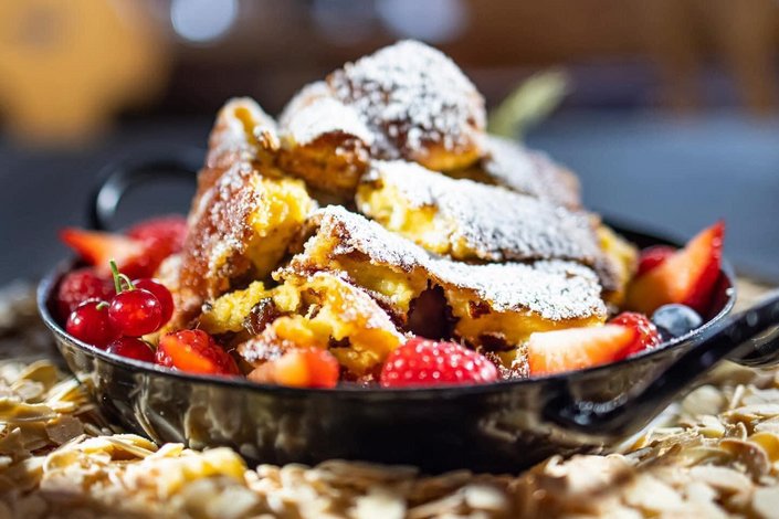 Nationale und internationale Köstlichkeiten aus regionalen, saisonalen und frischen Produkten serviert Junghotelier Markus Obermoser mit seinem langjährigen Team im Herzen Kitzbühels. Ein beliebter Treffpunkt für Gäste und Einheimische zum Kaffee auf der Sonnenterrasse oder auf ein paar Runden Watten oder Schnapsen (Kartenspiele).