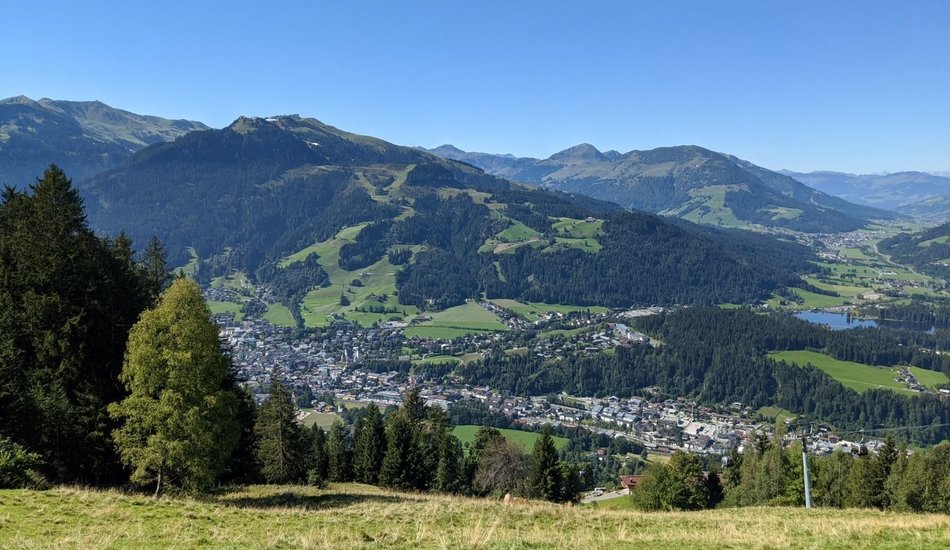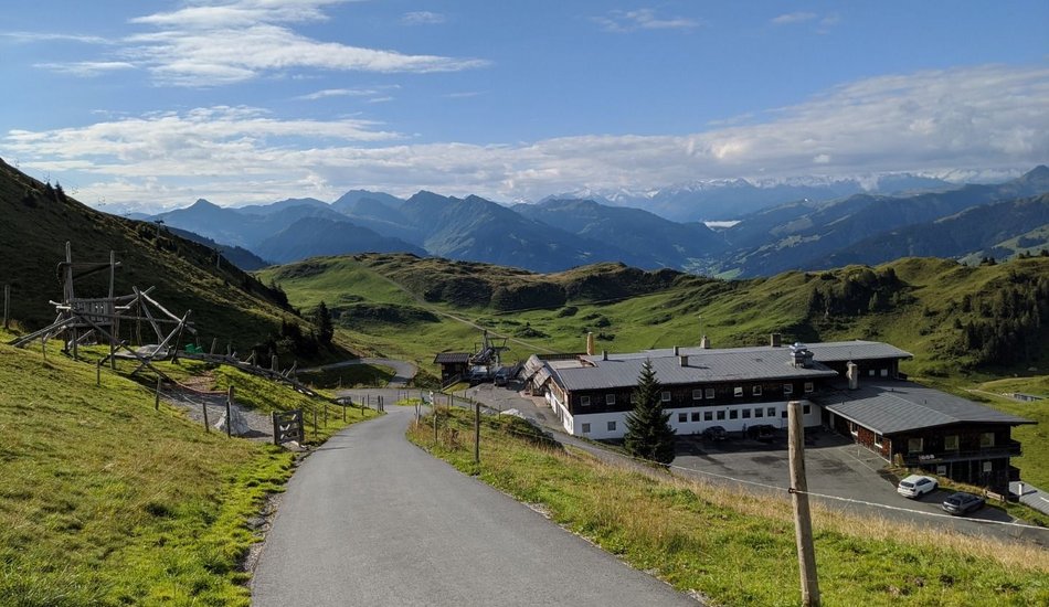 Weiter unten wird das Gelände flacher. Von dort sehen Sie bereits die Harschbichlalm und die Harschbichlbahn. Sie können entweder ein paar Höhenmeter zur Harschbichlbahn hinauf wandern (ca. 1 h ab dem Kitzbüheler Horn) und nach einer Einkehr bei der Harschbichlalm gemütlich ins Tal gondeln, oder Sie beenden diese Etappe per Pedes. Dann wandern Sie auf dem Forstweg talwärts zur Stanglalm.