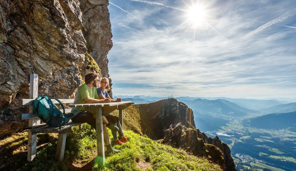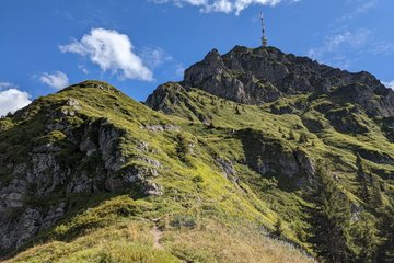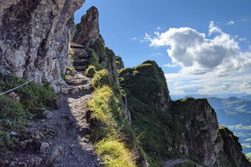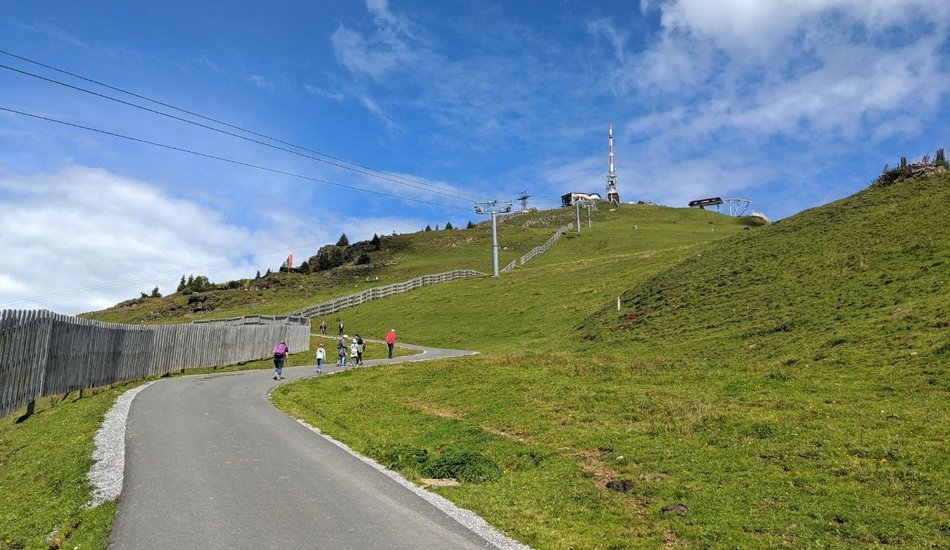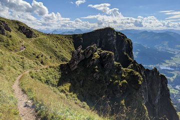 Dann auf dem Zufahrtsweg zum Kitzbüheler Horn weiter, bis Sie den Eingang zum Alpenblumengarten erreichen. Durch diesen hindurch und oben am Weg weiter zum Horngipfelhaus (50 min ab dem Alpenhaus) und dem Sender an der Spitze des Horns.Beim Abstieg wandern Sie bis zur Abzweigung nach St. Johann in Tirol, vorbei an einem markanten Aussichtskreuz auf ca. 1.900 Meter Seehöhe und am selben Weg retour. Hier zweigt ein mit Seil gut gesicherter Steig durch steiles Gelände ab (alternativ zum Scheibersteig kann der leichtere, aber längere beschilderte Hornrundwanderweggewählt werden). Ein spektakulärer Wegabschnitt an der Nordwestseite des Kitzbüheler Horns!