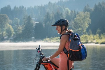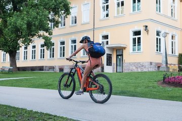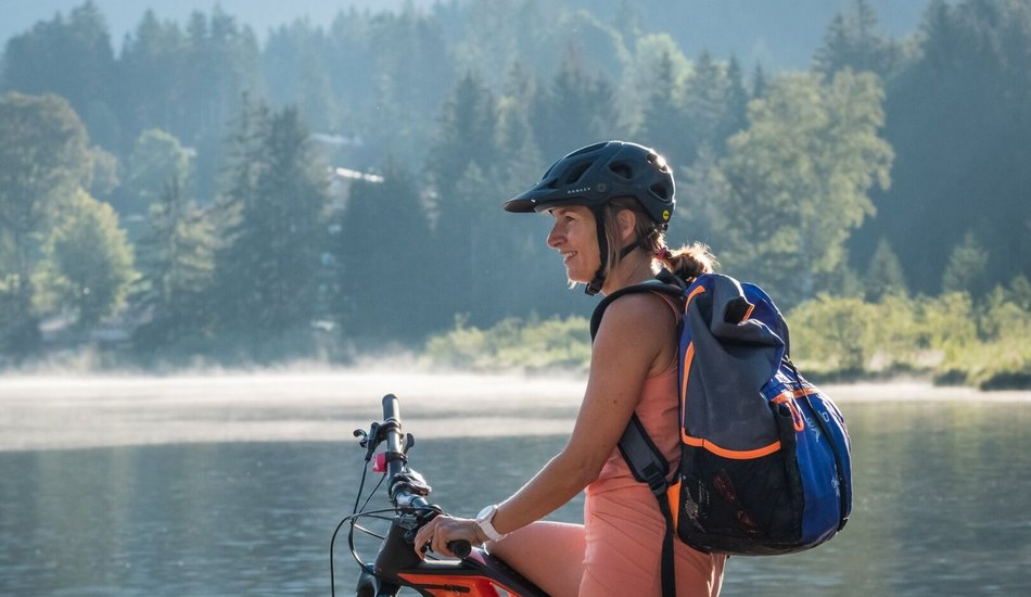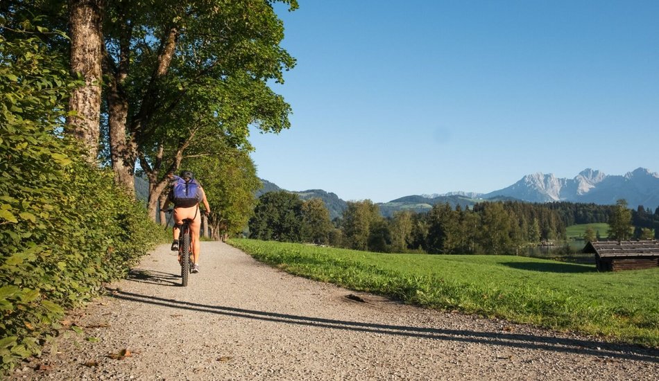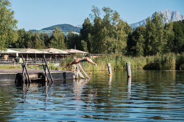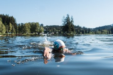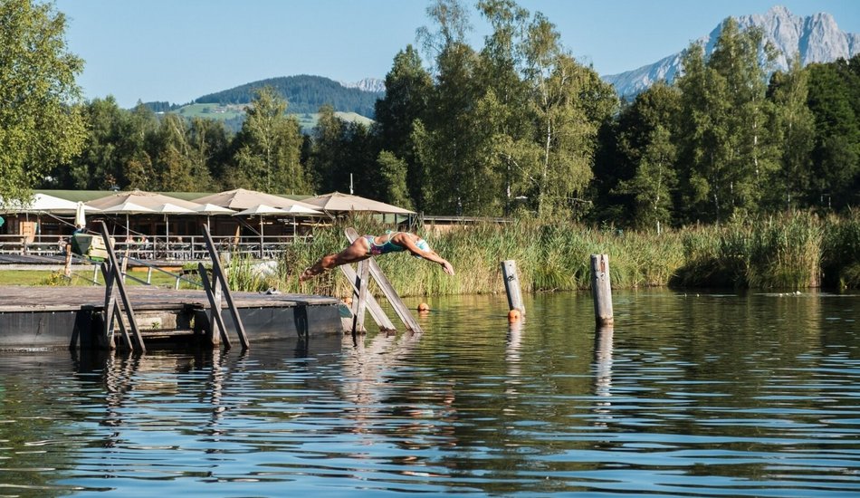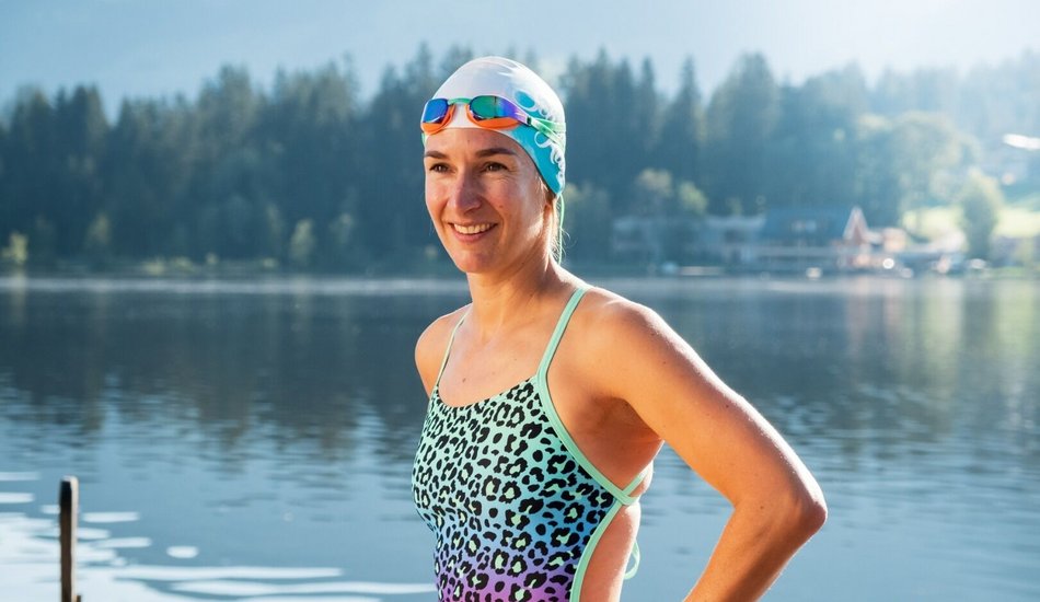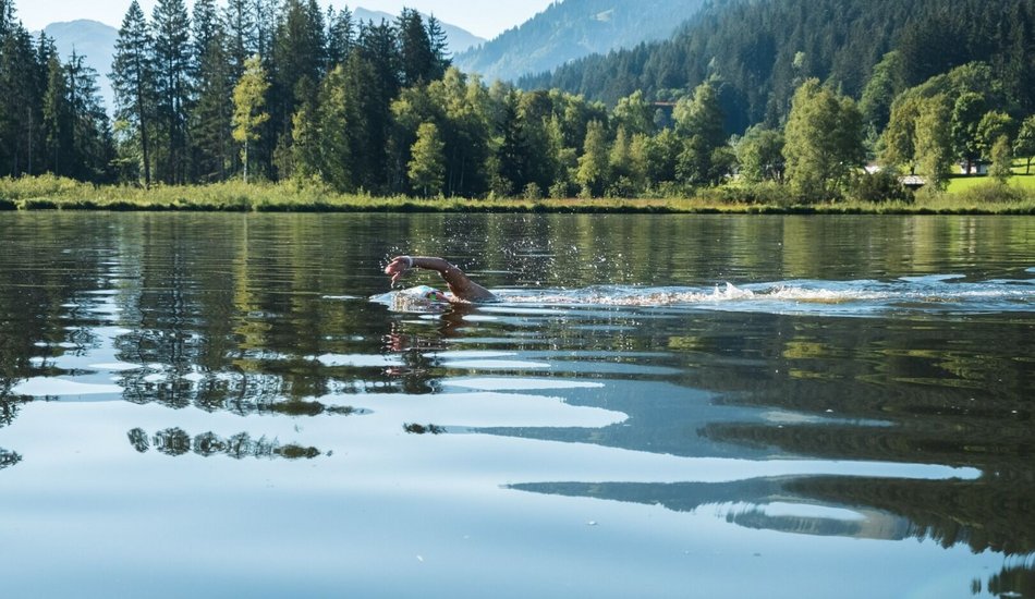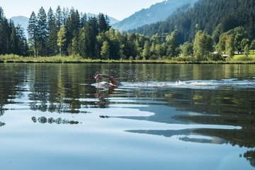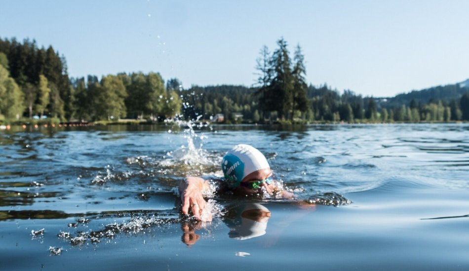 Zusammen mit Anne Götzendorfer, einer Schwimmlehrerin aus Kitzbühel, geht es heute zuerst mit dem Rad von der Innenstadt zum Schwarzsee. Aufgewärmt von den ersten morgentlichen Sonnenstrahlen geht es für Anne rein ins kühle nass. Genauer gesagt queer durch den 24°C warmen Moorsee. Der perfekte Start in einen warmen Sommertag.