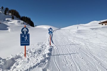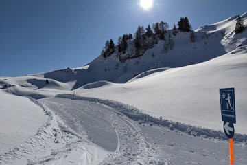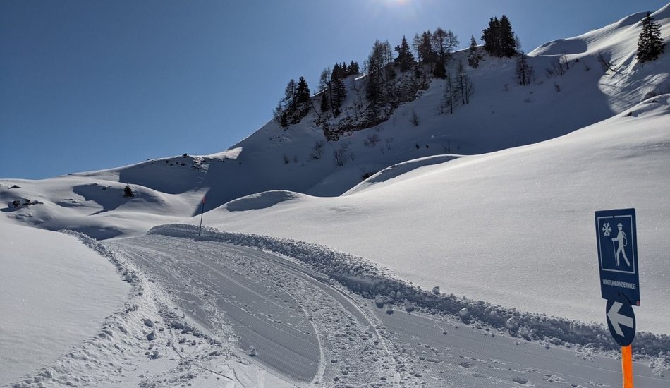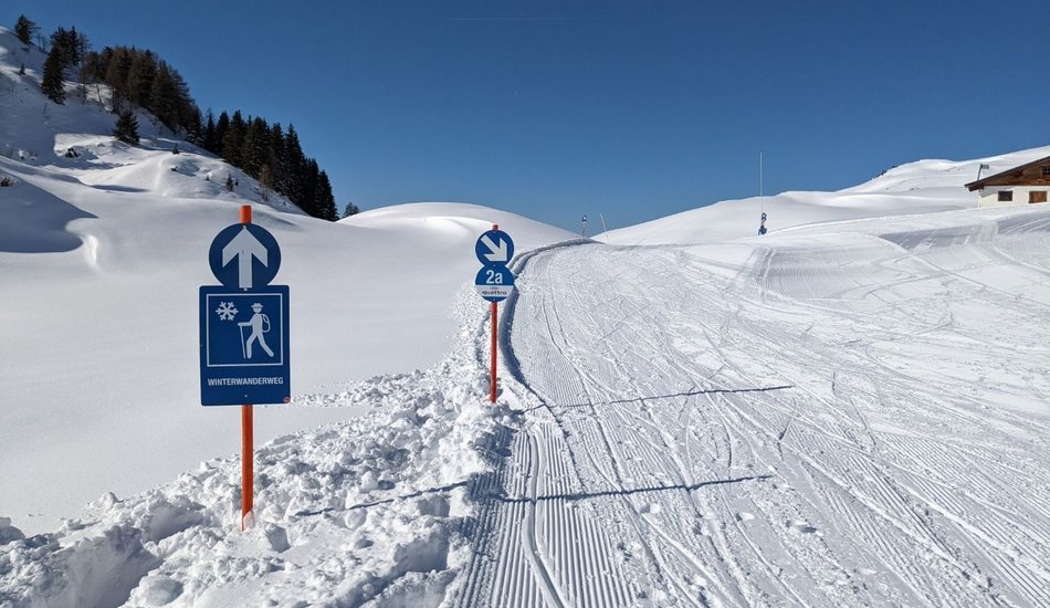 Abseits der markierten, gesicherten Winterwanderrouten befinden Sie sich im ungesicherten freiem Skiraum / Gelände. Das Wandern auf der Piste ist untersagt! Benutzung der Winterwanderrouten auf eigene Gefahr!