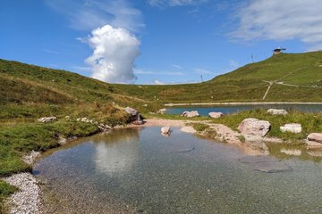Nach einer Abkühlung im See wandern sie erfrischt zum Alpenhaus zurück. Mit der Bahn fahren Sie wieder ins Tal.