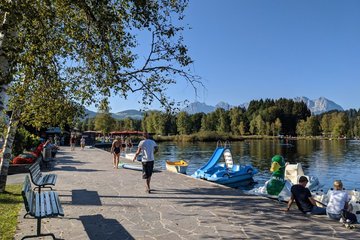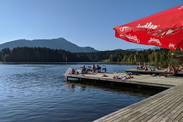Schwarzsee – Naherholungszentrum und Krafttankstelle der Kitzbüheler. Wir lassen unsere Wanderung bei einem energiespendenden Sommerdrink auf der Seeterrasse ausklingen, tauchen unsere Füße ins