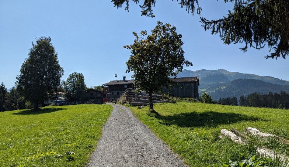 :: Über eine Asphaltstraße wandern wir den Steuerberg hinunter. Am Fuße des Hügels folgen wir der Beschilderung „Richtung Schwarzsee“. So gelangen wir zum Ausgangspunkt des KitzTrail BALANCE: dem