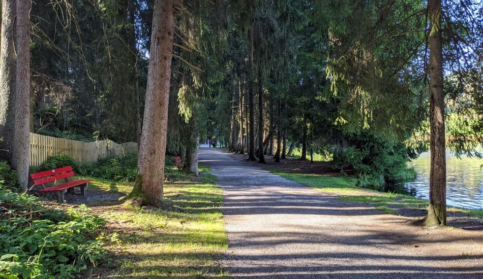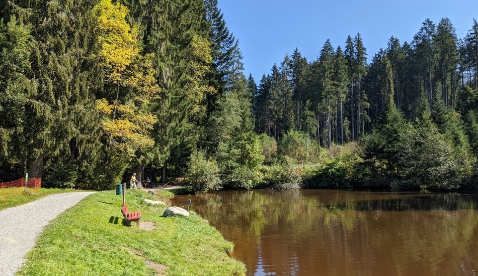 :: Wir starten am Schwarzsee vom (kostenlosen) Parkplatz des öffentlichen Seebades. Bei der großen KitzRunning Tafel überqueren wir eine kleine Brücke und wandern in Richtung Norden den Kitz-Trail BALANCE-Piktogrammen folgend.
