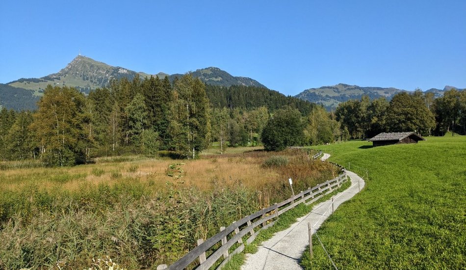 :: Auf ruhigen, schmalen Pfaden wandern wir über den Lutzenberg zum romantischen Schlosshotel Münichau aus dem 15. Jahrhundert und lassen dabei Lärm und Hektik des Alltags hinter uns. Weiter Richtung Osten erreichen wir nach ca. 30 Minuten den ersten Höhepunkt der Wanderung: den wild-romantischen Moorsee Gieringer Weiher mit grandioser Aussicht auf den Wilden Kaiser. Bei schönem Wetter nehmen wir ein erfrischendes Bad im erholsamen Waldbad (kostenpflichtig) und stärken uns danach mit feinen Köstlichkeiten im reizvollen Waldrestaurant. Das einzigartige Panorama des Wilden Kaisers stets im Blick, finden wir zur Ruhe und spüren ganz unsere Seele.
