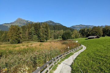 :: Auf ruhigen, schmalen Pfaden wandern wir über den Lutzenberg zum romantischen Schlosshotel Münichau aus dem 15. Jahrhundert und lassen dabei Lärm und Hektik des Alltags hinter uns. Weiter Richtung Osten erreichen wir nach ca. 30 Minuten den ersten Höhepunkt der Wanderung: den wild-romantischen Moorsee Gieringer Weiher mit grandioser Aussicht auf den Wilden Kaiser. Bei schönem Wetter nehmen wir ein erfrischendes Bad im erholsamen Waldbad (kostenpflichtig) und stärken uns danach mit feinen Köstlichkeiten im reizvollen Waldrestaurant. Das einzigartige Panorama des Wilden Kaisers stets im Blick, finden wir zur Ruhe und spüren ganz unsere Seele.