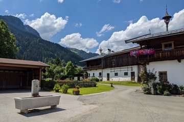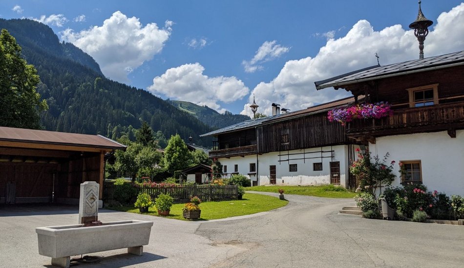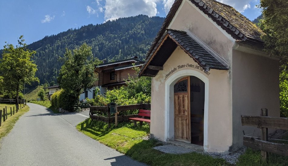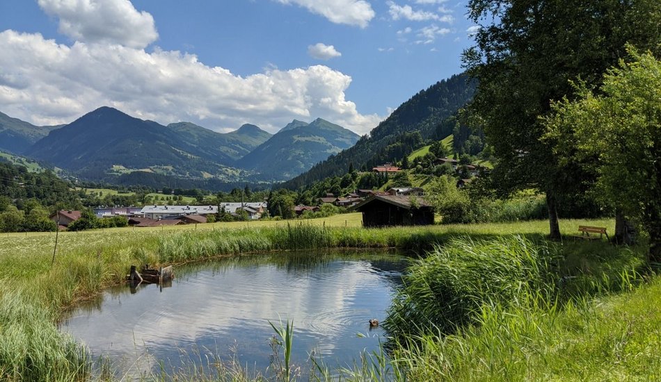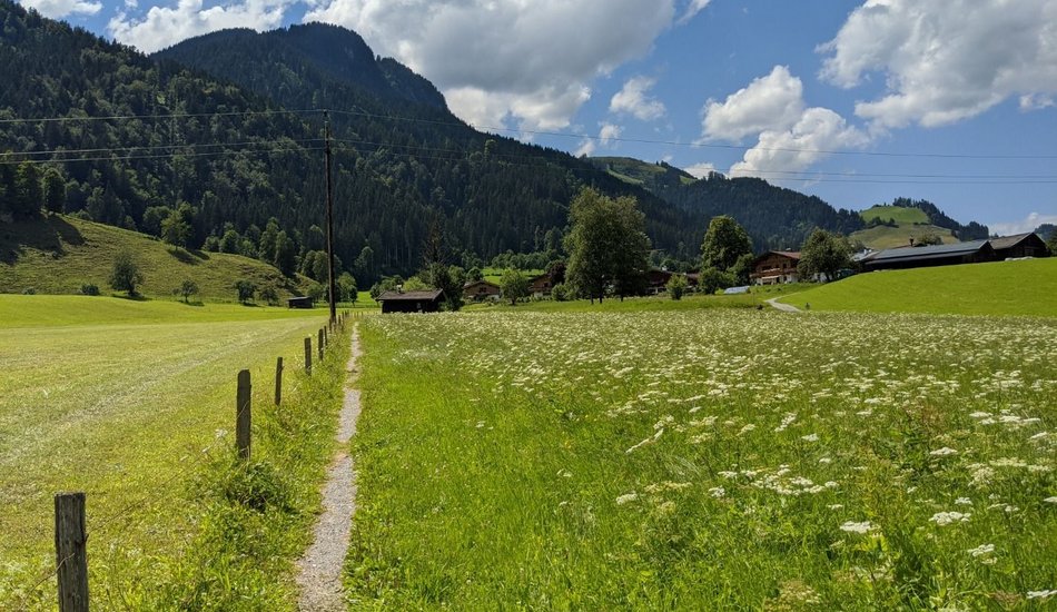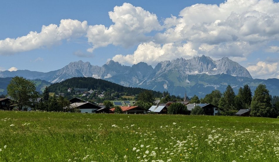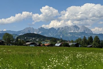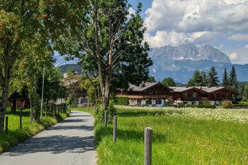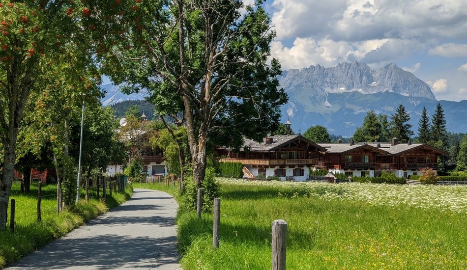 Wanderung zu einer südlich gelegenen Anhöhe von Kitzbühel mit alten Bauernhöfen und herrlicher Sicht auf das Wilde Kaiser Gebirge.