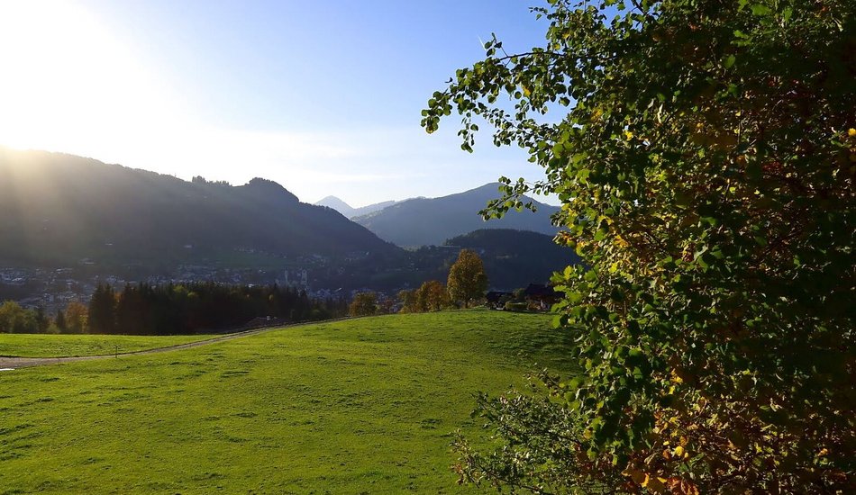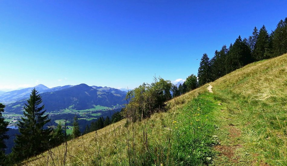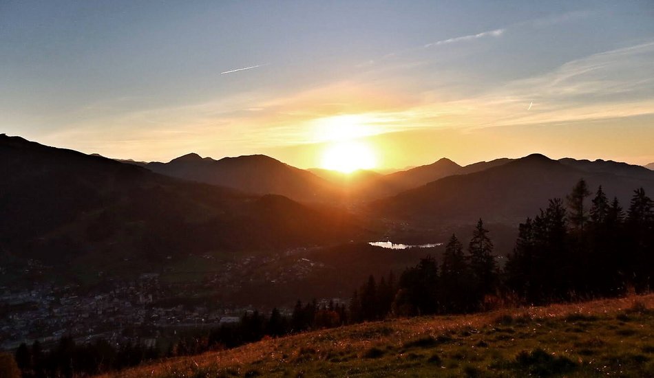 Wir starten bei der Talstation der Hornbahn Richtung „Hagstein“. Nach etwa 300 Metern auf Asphalt biegen wir nach rechts ab und kommen etwas oberhalb von Kitzbühel auf einem Wiesentrail, den wir bis zum „Unterleitenhof“ folgen. Von dort geht’s wechselweise über Asphalt und Schotter, bis wir wieder bei einem alten Hof nach links abbiegen und dann wieder rechts. Hier halten wir uns an den Wegweisern „Hagstein“. Der Trail führt uns durch den Wald aufwärts und ist somit auch an warmen Tagen ideal. Kurz vor „Hagstein“ biegen wir Richtung Mittelstation ab. Es geht weiter auf einem Trail aufwärts. Nur ein kurzes Stück Schotterstraße unterbringt unseren Rhythmus, bis wir auf einer Wiese oberhalb von Kitzbühel ankommen. Hier lässt sich ein Sonnenuntergang herrlich genießen. Es geht weiter bis zur Mittelstation und von dort dann ein knackiger Downhill bis zum Ausgangspunkt an der Hornbahn. Eine Runde, die man in Kitzbühel eigentlich gelaufen sein muss.