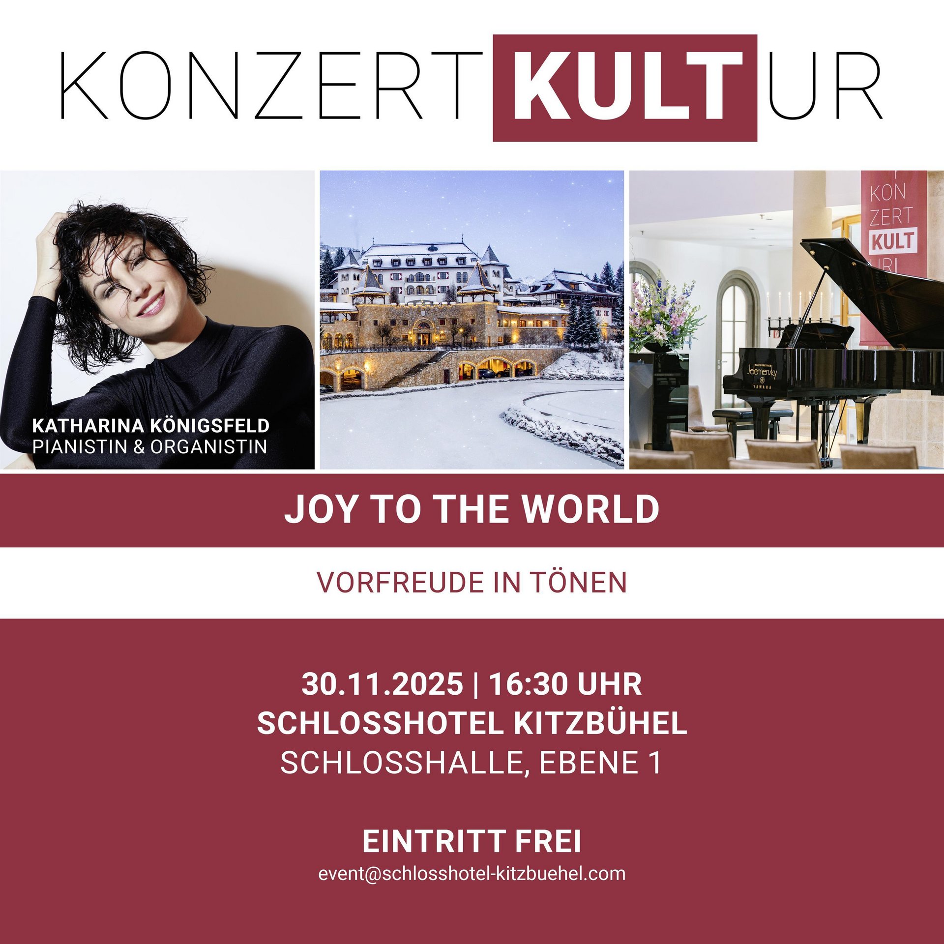 Das Schlosshotel Kitzbühel lädt zu einem stimmungsvollen Adventkonzert mit der renommierten Pianistin und Organistin Katharina Königsfeld. In der festlichen Atmosphäre der Schlosshalle erklingen ab 16:30 Uhr musikalische Highlights, die perfekt auf die Adventszeit einstimmen und Freude sowie Besinnlichkeit vereinen.
