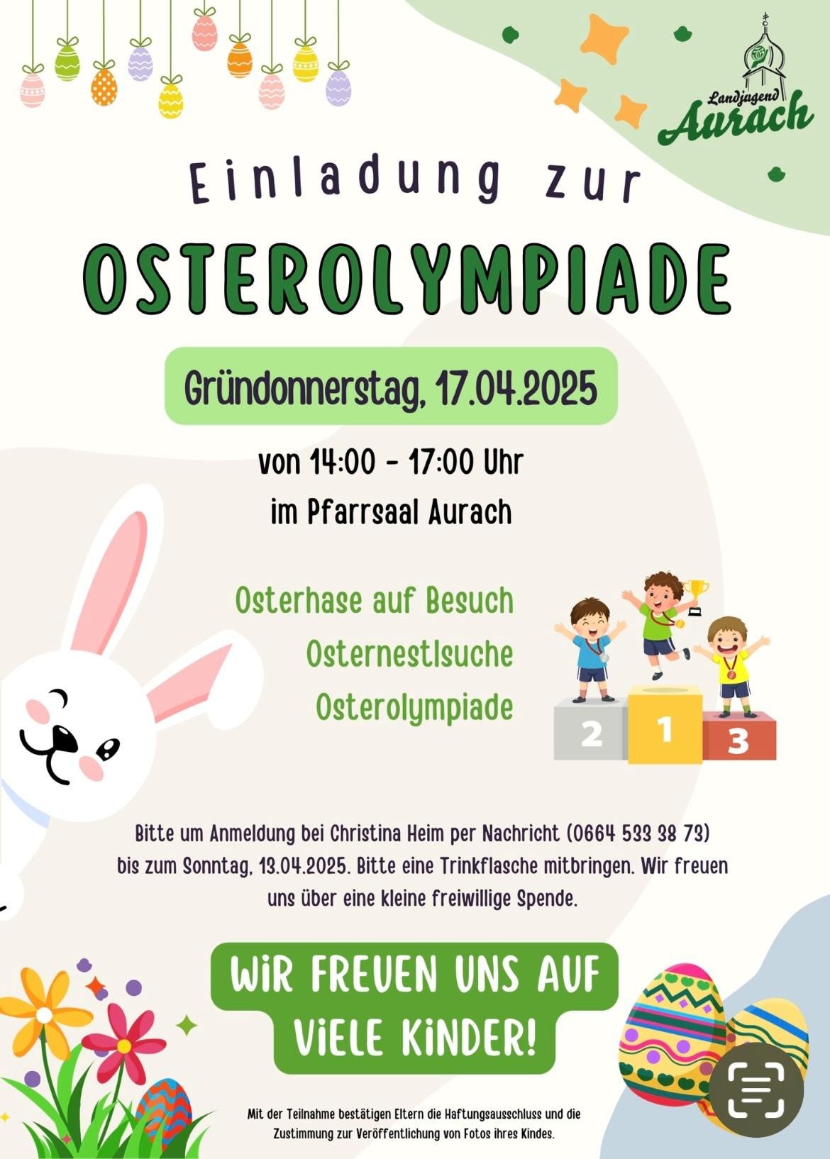 Der Osterhase ist auf Besuch, Osternestlsuche, Osterolympiade. Für den kleinen Hunger & Durst ist ebenso bestens gesorgt. Wir freuen uns auf viele Kinder.